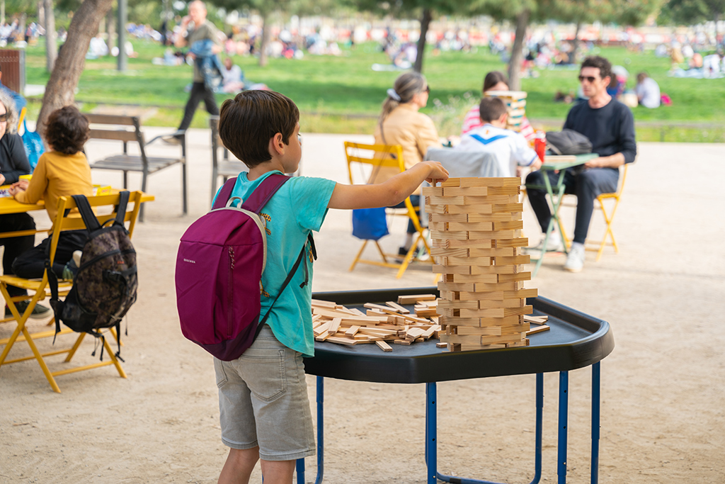 Todos los viernes, sábados y domingos del año, un quiosco de juegos en la Clariana del parc de les Glòries presta material lúdico y juegos de mesa para todas las edades.